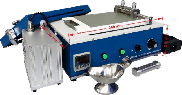 เครื่องเคลือบแผ่น MSK-AFA-HC100 มีขนาดการเคลือบสูงสุด 90 x 190 มม. แผ่นฐานจะถูกให้ความร้อนสูงสุด 120℃ สามารถใช้งานในห้องถ่ายโอนภายในกล่องปลอดอากาศได้ มีปั๊มสุญญากาศภายนอกให้มาด้วย ความแม่นยำของความหนาการเคลือบอยู่ที่ ±3 μm อุปกรณ์เสริมที่มีให้เลือก ได้แก่ เครื่องขูดเคลือบกว้าง 80 มม. แท่งลวด เครื่องทำฟิล์มสี่ด้าน และเครื่องทำฟิล์มขูดและผสมแบบอัดรีด