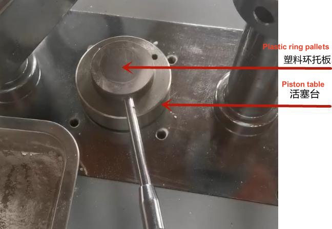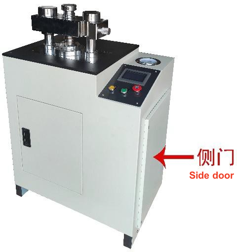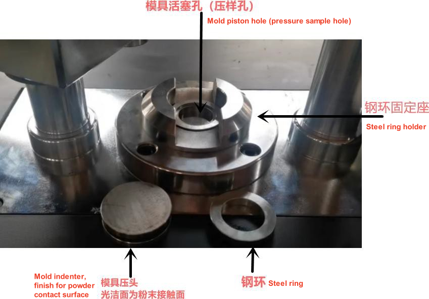 11. หลังจากถอดแม่พิมพ์ออกแล้ว ให้ถอดหัวกดแม่พิมพ์ออก แล้วนำตัวอย่างที่กดไว้ (B) ขั้นตอนการทำงานของแม่พิมพ์ถ้วยอลูมิเนียมด้วยแรงดันตัวอย่าง 1. ตั้งค่าแรงดันยึด/แรงดันทดแทน/เวลายึด และปรับค่าพารามิเตอร์อื่นๆ ตามสถานการณ์จริง 2. ดันคานให้เปิดออก นำถ้วยอลูมิเนียมเข้าไปในรูแม่พิมพ์ สามารถปรับความลึกของถ้วยอลูมิเนียมได้โดยการตั้งเวลารีเซ็ต 3. บรรจุตัวอย่างผงลงในถ้วยอลูมิเนียม 4.ปิดหัวกดแม่พิมพ์ 5. ปิดคานขวางและใส่ช่องคานขวางเข้าไปในบอสคอลัมน์ 6. ขันสกรูและยึดหัวเจาะแม่พิมพ์ 7. กดปุ่มเริ่มกดตัวอย่างค้างไว้ 8. หลังจากแรงกดยึดตัวอย่างเสร็จสิ้นแล้ว ให้คลายสกรู ดันคานออก และกดปุ่มถอดแม่พิมพ์เพื่อเริ่มถอดแม่พิมพ์ 9. หลังจากถอดแม่พิมพ์ออกแล้ว ให้ถอดหัวกดแม่พิมพ์ออก แล้วนำตัวอย่างที่กดไว้ (C) ขั้นตอนการทำงานของแม่พิมพ์แหวนเหล็กที่มีแรงดันตัวอย่าง แผนผังของพื้นที่ทำงาน 1. การตั้งค่า ค่าแรงดันคงที่/แรงดันเติม/ค่าเวลาคงที่ พารามิเตอร์อื่นๆ ปรับตามสถานการณ์จริง โดยลูกสูบควรอยู่ต่ำกว่ารูประมาณ 2-4 ซม. เพื่อสำรองพื้นที่สำหรับการโหลดตัวอย่างผง สามารถตั้งค่าตำแหน่งค้างของลูกสูบได้ 2. ดันคานออกและติดตั้งแหวนเหล็กเข้ากับตัวยึด 3. โหลดตัวอย่างผงลงในวงแหวนเหล็ก 4. ติดหัวเจาะแม่พิมพ์ โดยระวังให้ด้านสะอาดของหัวเจาะแม่พิมพ์คว่ำลง 5. ปิดคานขวางและใส่ช่องคานขวางเข้าไปในบอสคอลัมน์ 6. ขันสกรูและยึดหัวเจาะแม่พิมพ์ 7.กดปุ่มเริ่มกดตัวอย่างค้างไว้ 8. หลังจากแรงกดในการยึดตัวอย่างเสร็จสิ้น อุปกรณ์จะระบายแรงกดโดยอัตโนมัติ คลายสกรู ดันคานออก ถอดหัวกดแม่พิมพ์ออก แล้วจึงนำตัวอย่างที่ถูกกดออก (D) ขั้นตอนการทำงานของแม่พิมพ์แหวนพลาสติกแบบแรงดันตัวอย่าง 1. ตั้งค่าแรงดันคงที่/แรงดันเติม/เวลาคงที่ และค่าพารามิเตอร์อื่นๆ จะถูกปรับตามสถานการณ์จริง 2. ดันคานให้เปิดออก เริ่มโหลดตัวอย่าง วงแหวนพลาสติก พาเลทวงแหวนพลาสติก (สังเกตว่าด้านเรียบของพาเลทวงแหวนพลาสติกที่หงายขึ้น) จะต้องวางไว้ตรงกลางหัวกดใต้คาน รุ่นบางรุ่นมีตัวหยุดตำแหน่ง พาเลทสามารถวางชิดกับตัวหยุดได้ 3. วางวงแหวนพลาสติกบนพาเลทและเทตัวอย่างผงลงในวงแหวน 4. หลังจากโหลดตัวอย่างแล้ว ให้ปิดคาน สอดส่วนเว้าของคานเข้าไปในหัวนูนของคอลัมน์ กดปุ่มเริ่ม เริ่มกดตัวอย่างและกดค้างไว้ 5. เมื่อเวลาการยึดสิ้นสุดลงและลูกสูบถูกรีเซ็ตโดยอัตโนมัติ ให้ดันคานออกและนำตัวอย่างที่ถูกกดออก I. ข้อควรระวังในการใช้งานและการบำรุงรักษาอุปกรณ์ 1. ทำความสะอาดฝุ่นละอองและสิ่งสกปรกอื่นๆ หลังการใช้งาน รักษ