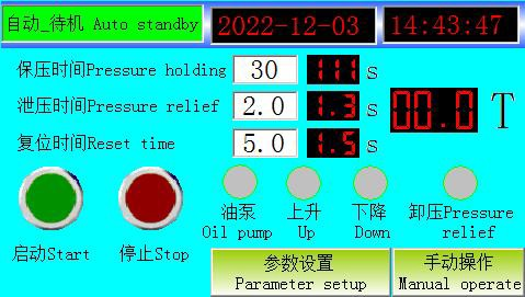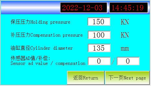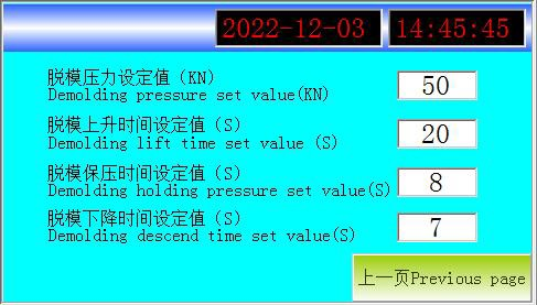 11. ค่าการตั้งค่าความดันในการถอดแบบ: นั่นคือ ตัวอย่างจะถูกถอดแบบหลังจากการกดเสร็จสิ้น และกระบวนการยกจะไม่เกินค่าการตั้งค่าความดันในการถอดแบบ 12. ค่าการตั้งค่าเวลายกของการถอดแบบ: นั่นคือ การถอดแบบจะดำเนินการหลังจากการกดตัวอย่างเสร็จสิ้น และลูกสูบจะหยุดยกขึ้นเมื่อยกขึ้นเพื่อดันตัวอย่างออก และถึงค่าการตั้งค่าเวลายกของการถอดแบบ