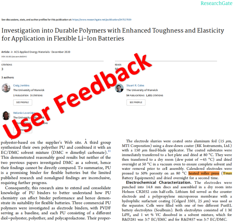 5 วันเครื่องรีดขึ้นรูปนี้ ออกแบบมาสำหรับ การ รีด วัสดุแบตเตอรี่โลหะมีค่าปริมาณเล็กน้อย (ทอง เงิน) และโลหะที่ไม่ใช่เหล็ก (ทองแดง อะลูมิเนียม) ในระดับ ห้อง ปฏิบัติการ ภายใต้ สภาวะการให้ความร้อน ที่ควบคุมได้เครื่องนี้สามารถปรับความหนาของการรีดได้ และใช้งานง่ายจึงเหมาะอย่างยิ่งสำหรับการรีดและเพิ่มความหนาแน่นของอิเล็กโทรดแบตเตอรี่ลิเธียมในการใช้พลังงานสะอาด