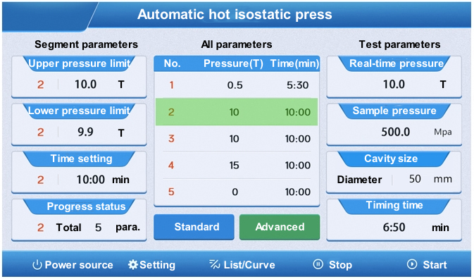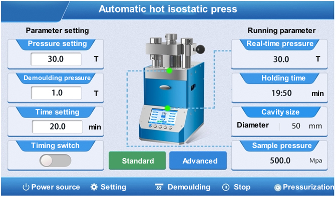 อินเทอร์เฟซมาตรฐาน: สามารถตั้งค่า พารามิเตอร์ต่างๆ เช่น แรงกดการขึ้นรูปเวลา ขนาดตัวอย่าง ฯลฯ ได้ในอินเทอร์เฟซนี้เพียงอย่างเดียว