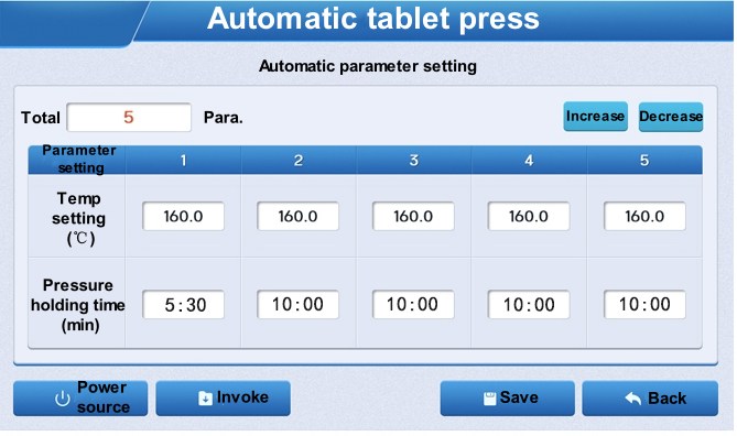 ปุ่มเรียก:เรียกพารามิเตอร์ที่ตั้งไว้ไปยังอินเทอร์เฟซการทำงานอัตโนมัติเพื่อสร้างแรงกดดัน