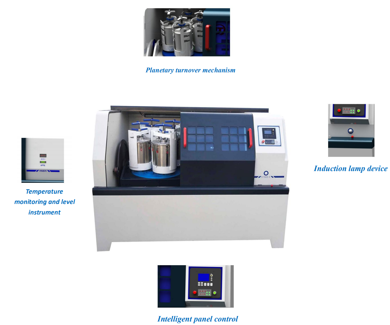 เครื่องบดแบบลูกกลิ้งดาวเคราะห์รอบทิศทางนี้ใช้หลักการเดียวกับเครื่องบดแบบลูกกลิ้งแนวตั้ง โดยเพิ่มฟังก์ชันการหมุนแบบดาวเคราะห์และการพลิกคว่ำ เมื่อวัสดุในจานดาวเคราะห์และโถบด เป็น แบบดาวเคราะห์ ลูกบอลสามารถพลิกคว่ำได้ 360 องศาในพื้นที่คงที่ ทำให้ลูกบอลและวัสดุในโถบดมีการเคลื่อนที่แบบหลายมิติ และปรับปรุงการเคลื่อนที่ของลูกบอลและวัสดุให้เป็นระเบียบ ไม่มีการเจียรแบบมุมตายสำหรับวัสดุทั้งหมดในถังบด ทำให้วัสดุบดมีความสม่ำเสมอมากขึ้น และสามารถแก้ปัญหาวัสดุบางชนิดจมลงไปก้นถังและติดถังได้อย่างมีประสิทธิภาพ