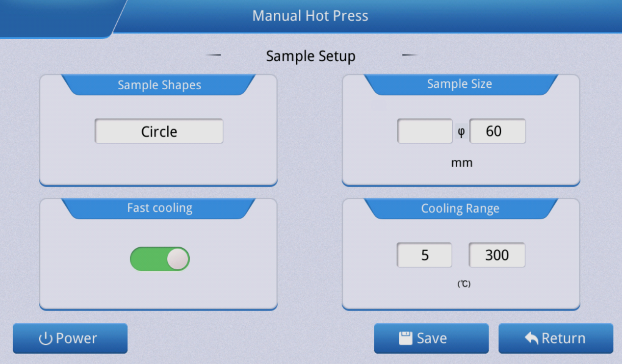การตั้งค่าตัวอย่าง: สามารถตั้งค่ารูปร่างและขนาดของตัวอย่างเพื่อให้ผู้ใช้คำนวณแรงดันของตัวอย่างได้ง่าย