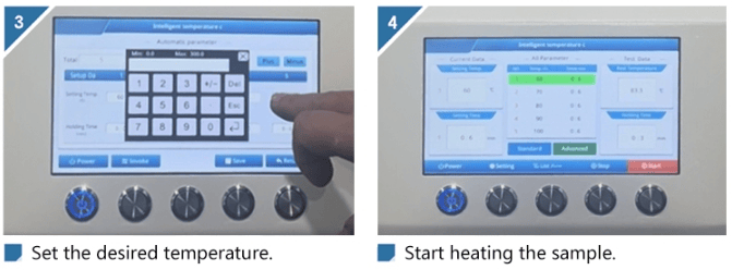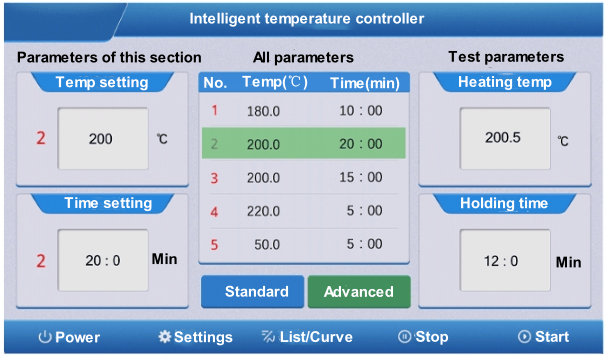 ปุ่มเริ่ม:ในโหมดขั้นสูง โดยการคลิกปุ่มเริ่ม ก็สามารถอุ่นเครื่อง อัดไฮดรอลิกได้ตามโปรแกรมการทำความร้อนหลายขั้นตอน
