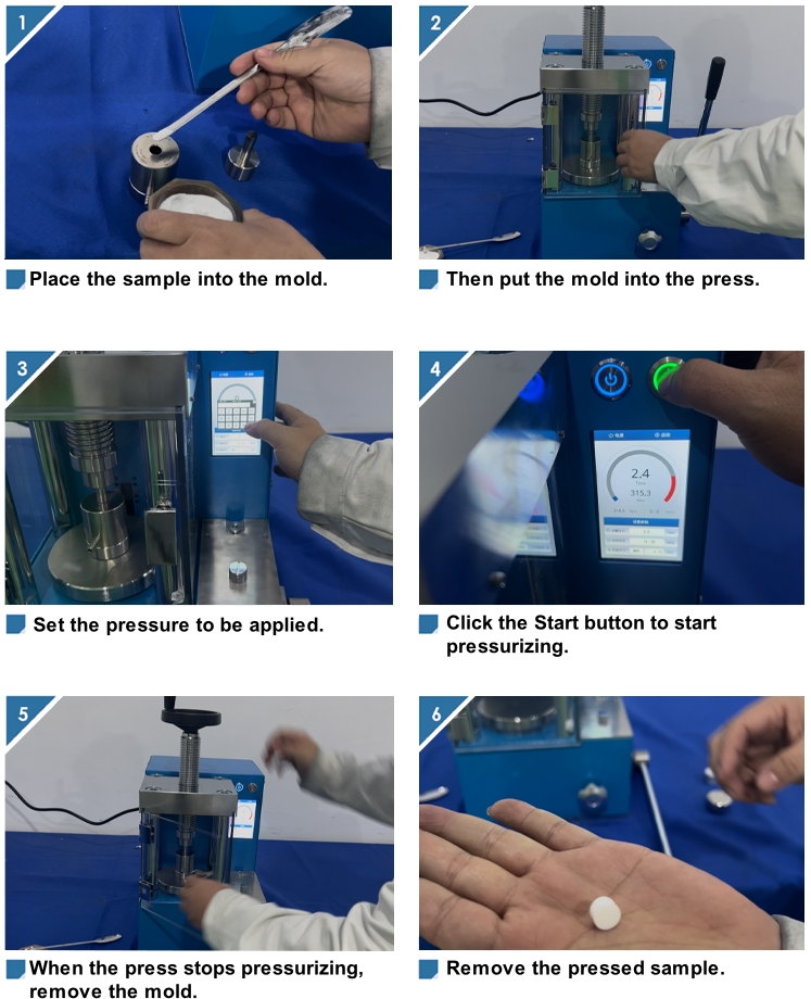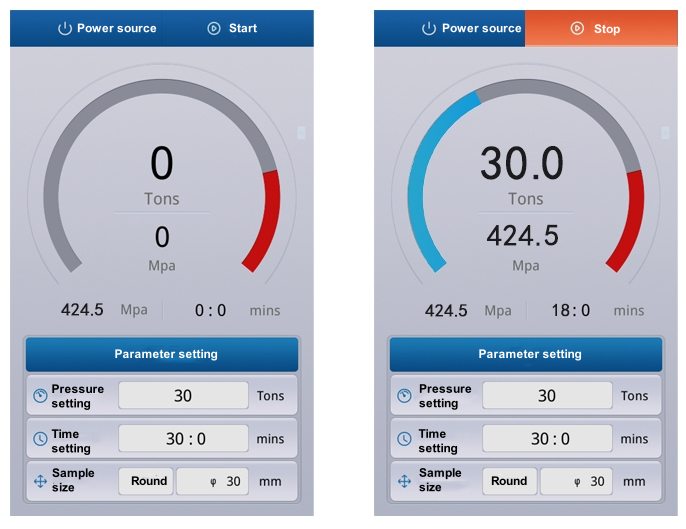 ขนาดตัวอย่าง:ตั้งค่ารูปร่างและขนาดของตัวอย่าง อุปกรณ์จะคำนวณแรงดันของตัวอย่างโดยอัตโนมัติตามขนาดที่คุณตั้งค่า เพื่อไม่ให้เกิดแรงดันเกิน