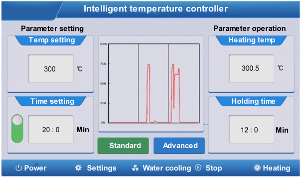 ปุ่มเริ่ม:ในโหมดขั้นสูง โดยการคลิกปุ่มเริ่ม ก็สามารถอุ่นเครื่อง อัดไฮดรอลิกได้ตามโปรแกรมการทำความร้อนหลายขั้นตอน