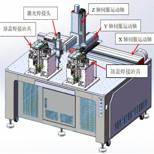 อุปกรณ์นี้ใช้สำหรับปิดผนึกรอยเชื่อมและเชื่อมรูฉีดของเหลวของฝาครอบด้านบนของแบตเตอรี่เปลือกอลูมิเนียมสี่เหลี่ยม เป็นอุปกรณ์กึ่งอัตโนมัติ ฝาครอบด้านบนที่เข้ามาถูกรัดเข้ากับเปลือกอลูมิเนียมด้วยมือ โดยใช้พื้นผิวปิดผนึกแบตเตอรี่เป็นเกณฑ์มาตรฐานด้านบน โดยจัดวางตำแหน่งจากด้านบนของแผ่นด้านล่างของเซลล์ หลังจากการเชื่อมด้วยเลเซอร์แล้ว จะมีการตรวจหาและประเมินผลด้วยตนเอง อุปกรณ์นี้สามารถเปลี่ยนอุปกรณ์ได้อย่างรวดเร็ว และเหมาะสำหรับการเชื่อมผลิตภัณฑ์หลายรุ่น