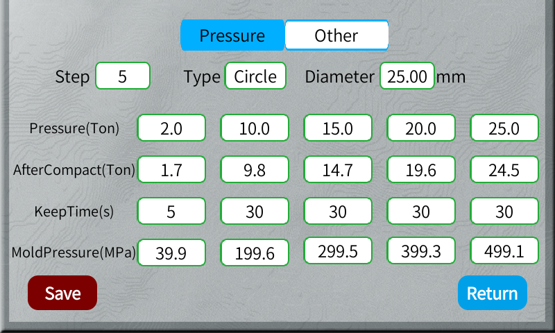 > การตั้งค่าแรงดัน : เมื่อเลือกระดับแรงดันเป็น "1" จะสามารถตั้งค่าแรงดันได้เพียง 1 ระดับเท่านั้น และตั้งค่าแรงดันไปเรื่อยๆ เลือกระดับแรงดันได้หลายระดับ และสามารถตั้งค่าแรงดันได้เพียงไม่กี่ระดับเท่านั้น ค่าแรงดันจะเพิ่มขึ้น และระดับแรงดันถัดไปต้องไม่ต่ำกว่าค่าแรงดันก่อนหน้า แต่ค่าแรงดันสูงสุดต้องไม่เกินค่าแรงดันของแท่นกดเม็ดยา แต่ละระดับสามารถตั้งค่าชดเชยแรงดันและเวลาการกดได้อย่างอิสระ หากไม่ต้องการใช้แรงดันหลายระดับ ขอแนะนำให้ตั้งค่าระดับแรงดันเป็น "1" เมื่อถึงค่าแรงดันที่ต้องการจะเข้าสู่ระดับแรงดันการกด "ดูรายละเอียดเพิ่มเติมในการตั้งค่าเวลาการกด"