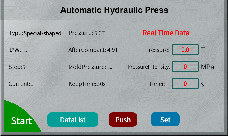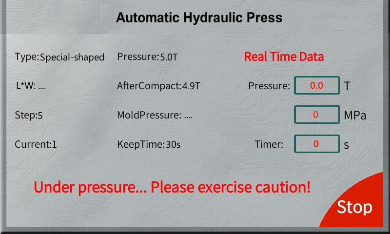 หลังจากตั้งค่าแรงดันแล้ว คุณสามารถคลิก ปุ่ม " เริ่ม" บนอินเทอร์เฟซหลักเพื่อเริ่มการสร้างแรงดัน (โปรดตรวจสอบให้แน่ใจว่าวางแม่พิมพ์อย่างถูกต้องก่อนการสร้างแรงดัน สำหรับรายละเอียดเพิ่มเติม โปรดดูขั้นตอนการเตรียมแม่พิมพ์ "3" ในหน้าถัดไป) โปรดใส่ใจกับข้อมูลแรงดันแบบเรียลไทม์บนอินเทอร์เฟซหลักและสภาวะจริงของแม่พิมพ์เพื่อปรับสถานะเครื่องให้ทันเวลา ในกรณีฉุกเฉิน คุณสามารถคลิก ปุ่ม " หยุด" บนหน้าจอเพื่อหยุดการสร้างแรงดัน หรือกด ปุ่ม " สวิตช์หยุดฉุกเฉิน" ที่ด้านบนของเครื่องโดยตรงเพื่อหยุดเครื่องฉุกเฉิน